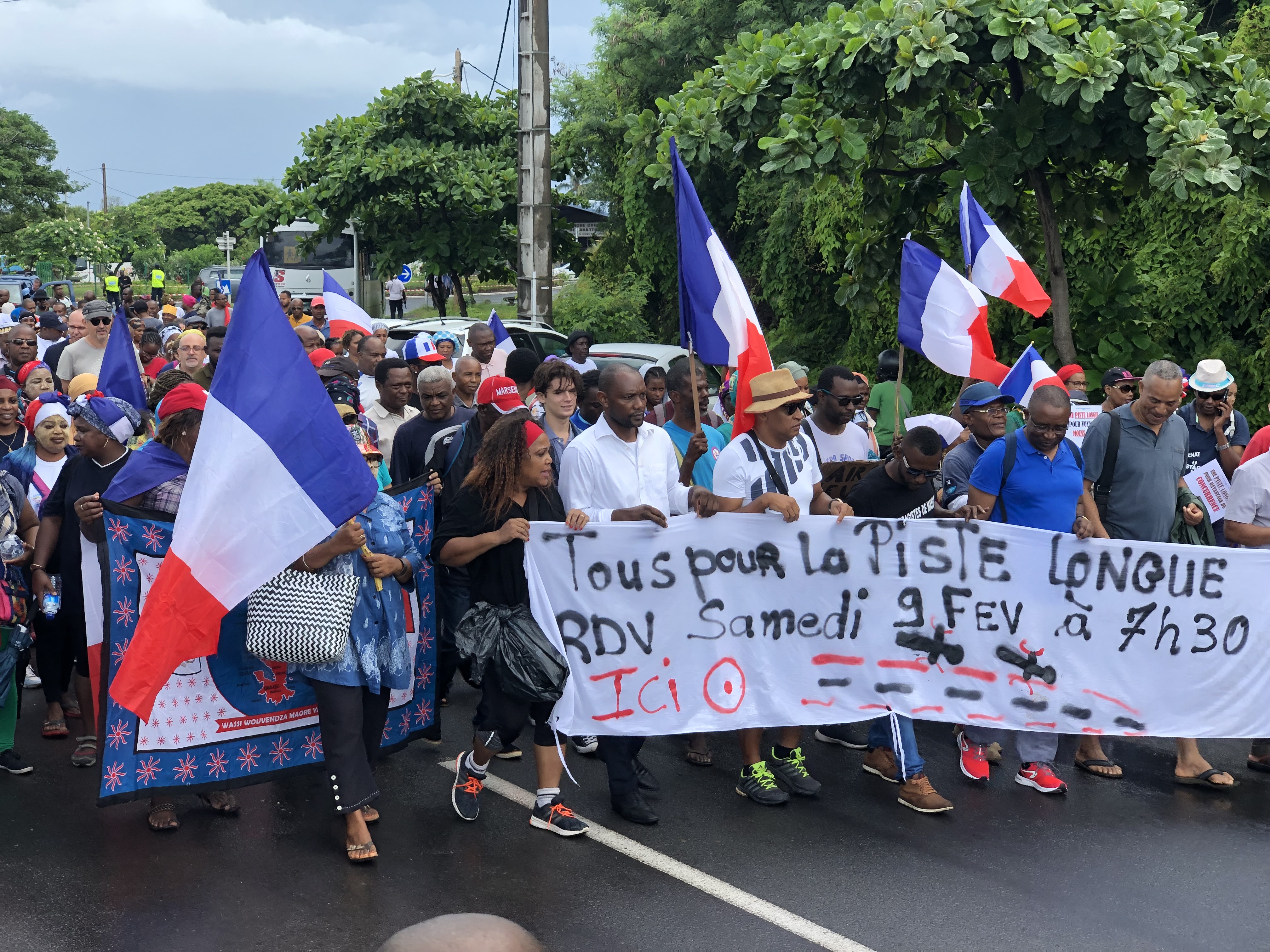 Initialement prévue à 9h30, c’est avec une heure-trente de retard que la mobilisation « tous à l’aéroport » débuta certainement retardée par la forte pluie comme vache qui pissait. C’est devant les quelques cent-cinquante personnes présentes que Zaou et Balahachi prirent tour à tour la parole leur demandant de se regrouper et à la dizaine de métropolitains « de ne pas avoir peur car ils aussi chez eux ». Sous très bonne escorte de forces de l’ordre, la manifestation prit la direction de l’aéroport, passant devant la station Total avec ses banderoles hostiles au groupe pétrolier, seul sur le territoire et qui vend son kérosène 84% plus cher que dans le Département voisin de l’île Bourbon. Quant à Air Austral, seule compagnie aérienne, à relier Mayotte à la Réunion et à l’Hexagone, ses pires dépassent l’entendement sur un territoire dont 80% de sa population vit sous le seuil de la pauvreté.