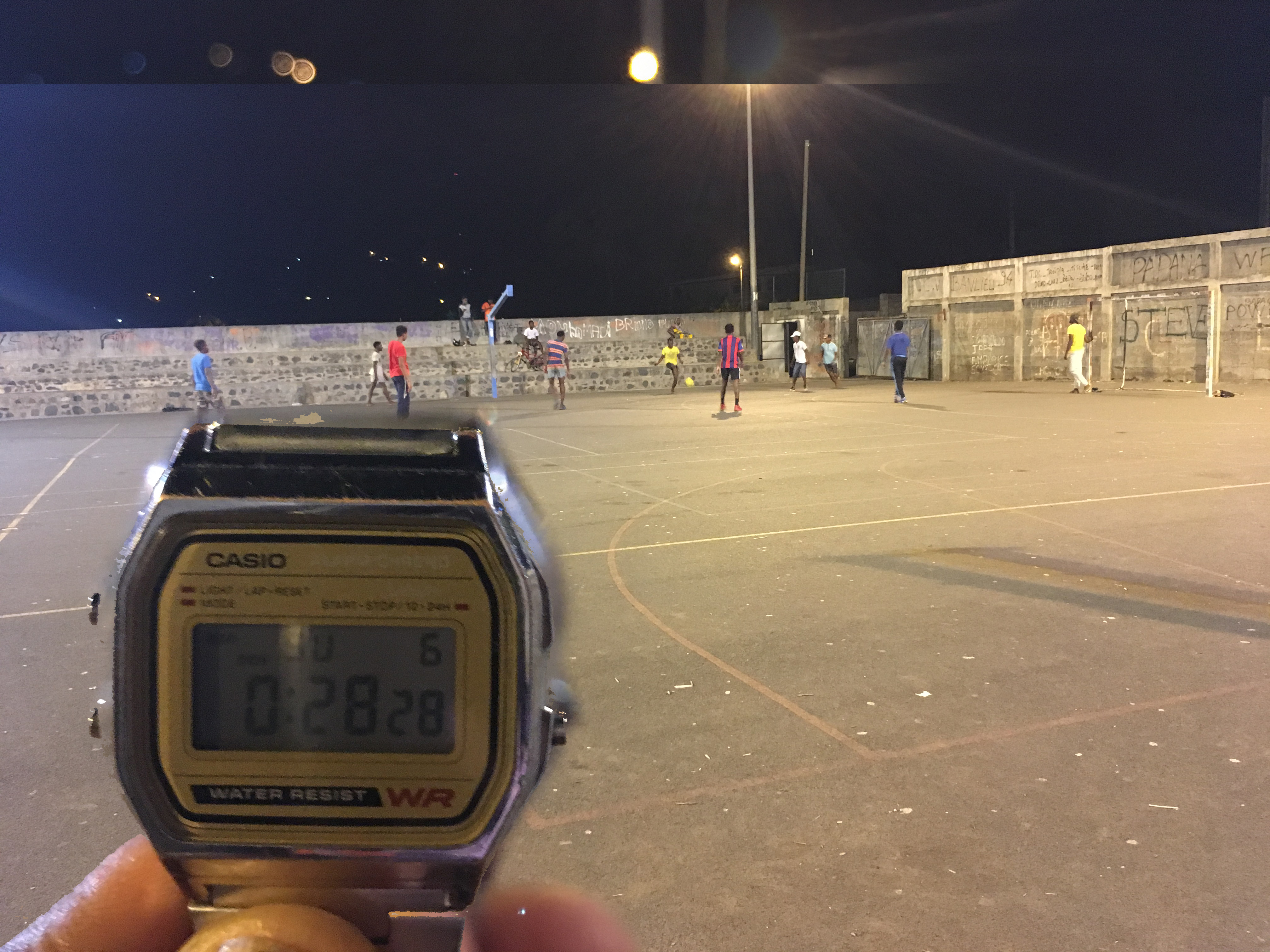 En effet, alors que l’arrêté interdit tout rassemblement en groupe non préalablement autorisé de plus de cinq individus mineurs, des parties de futsal sont organisées tous les soirs sur ledit plateau et ce, très souvent à partir de 21h et jusqu’à tard dans la nuit. Pour preuve, c’est à plus de minuit que l’un de nos journalistes a constaté les faits, comme vous pouvez le constater sur l’image et sa montre devant l’objectif de son appareil photo.